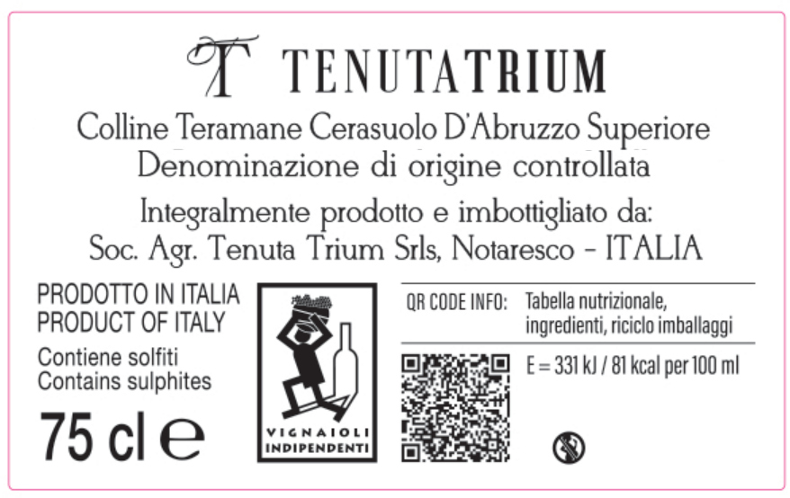 100% Montepulciano d’Abruzzo su pergola abruzzese età 50 anni. Gradazione 15°.