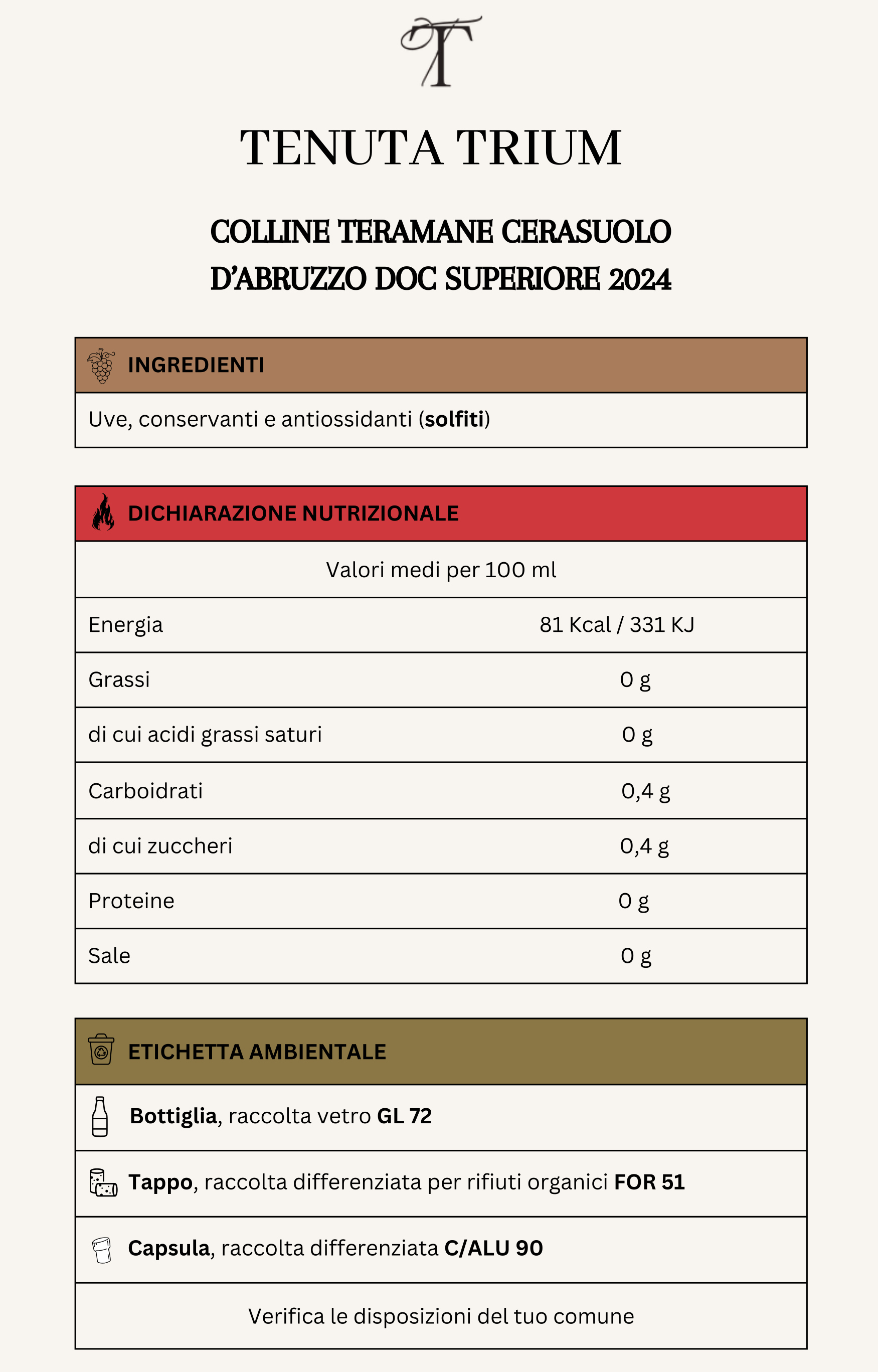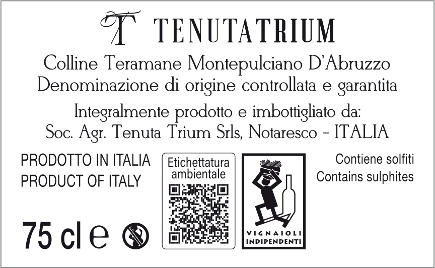 100% Montepulciano d’Abruzzo su pergola abruzzese età 50 anni. Gradazione 14,5°. Le uve appena raccolte vengono subito diraspate e pigiate.